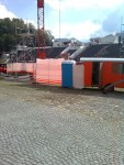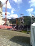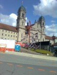 Vor der Einsiedler Klosterkirche steht ein Bataillon roter Betonmischer mit weit aufgerissenen Mündern, rechts und links davon Kräne, verteilt über den Platz blaue Toilettenhäuschen und Bauwagen. Strassenarbeiter in orangen Overalls entsorgen herumliegende Kehrichtsäcke. Ein mächtiges Donnern über den Köpfen der Zuschauer kündigt ein Flugzeug an, im hellblauen Abendhimmel kreisen aber nur ein paar aufgescheuchte Krähen. Es sind gerade auch diese ganz kleinen Nebenschauplätze eines Freilichtspieles, welche seinen Reiz ausmachen: Ein Hund bellt ganz ungefragt ins Geschehen, eine Amsel schmettert ihr Lied mitten ins Chaos.